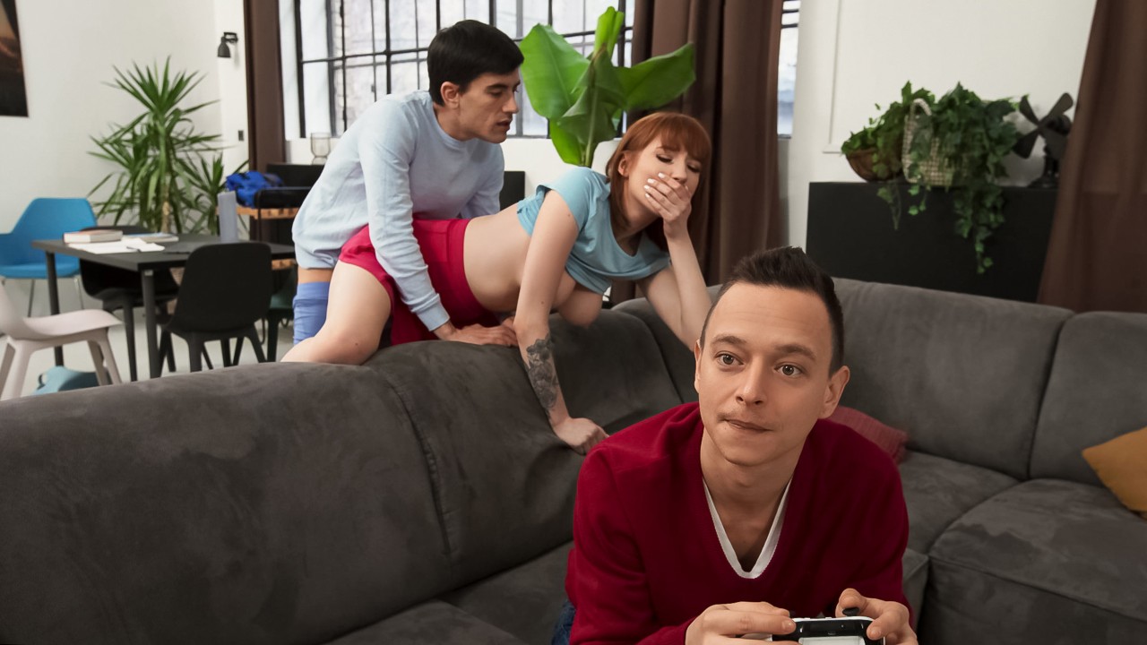 JordiEl NinoPolla baise Lilly Mays, une rousse sexy derrière le dos de son BF de jeu.